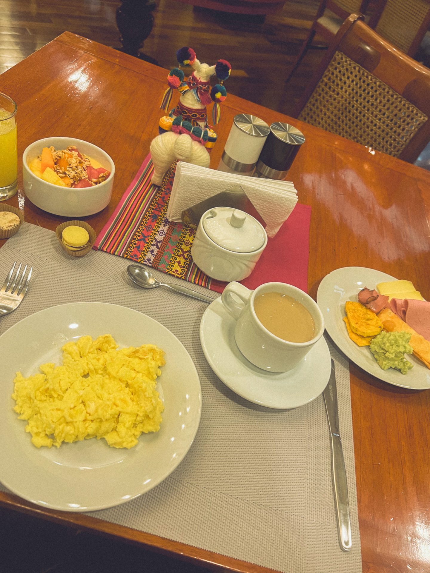 Irgendwann knurrte mein Magen, und ich machte mich auf den Rückweg ins Hotel. Ich versuchte, ohne Navi zurechtzukommen, und kam auf dem Weg noch an ein paar guten Fotospots vorbei, von denen aus ich die Berge noch einmal fotografieren konnte. Als ich schließlich im Hotel ankam, legte ich mich erst einmal kurz ins Bett und wartete, bis ich bereit fürs Frühstück war. Gegen 8 Uhr ging ich nach unten und bediente mich am Buffet. Es gab Semmeln, Obstsalat und natürlich wieder Rührei. 🍳