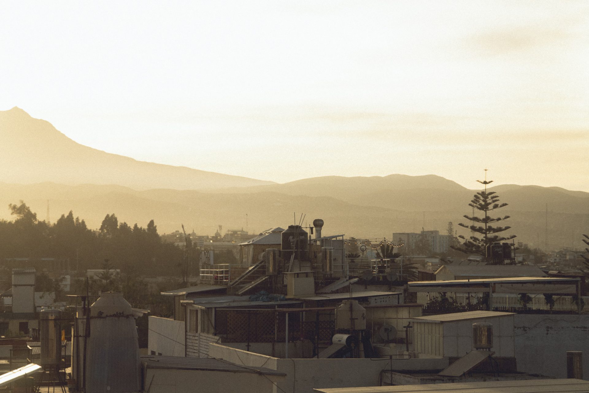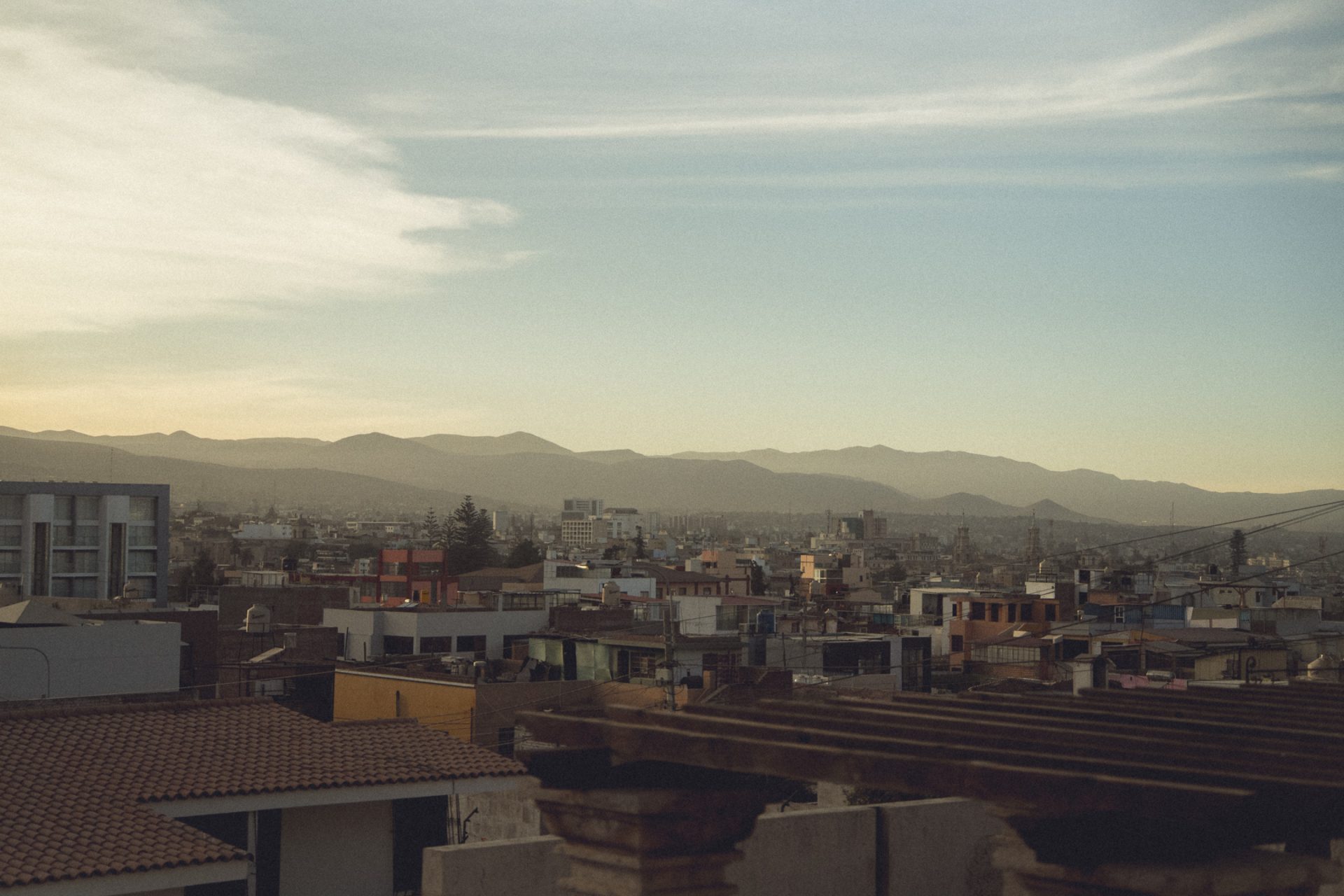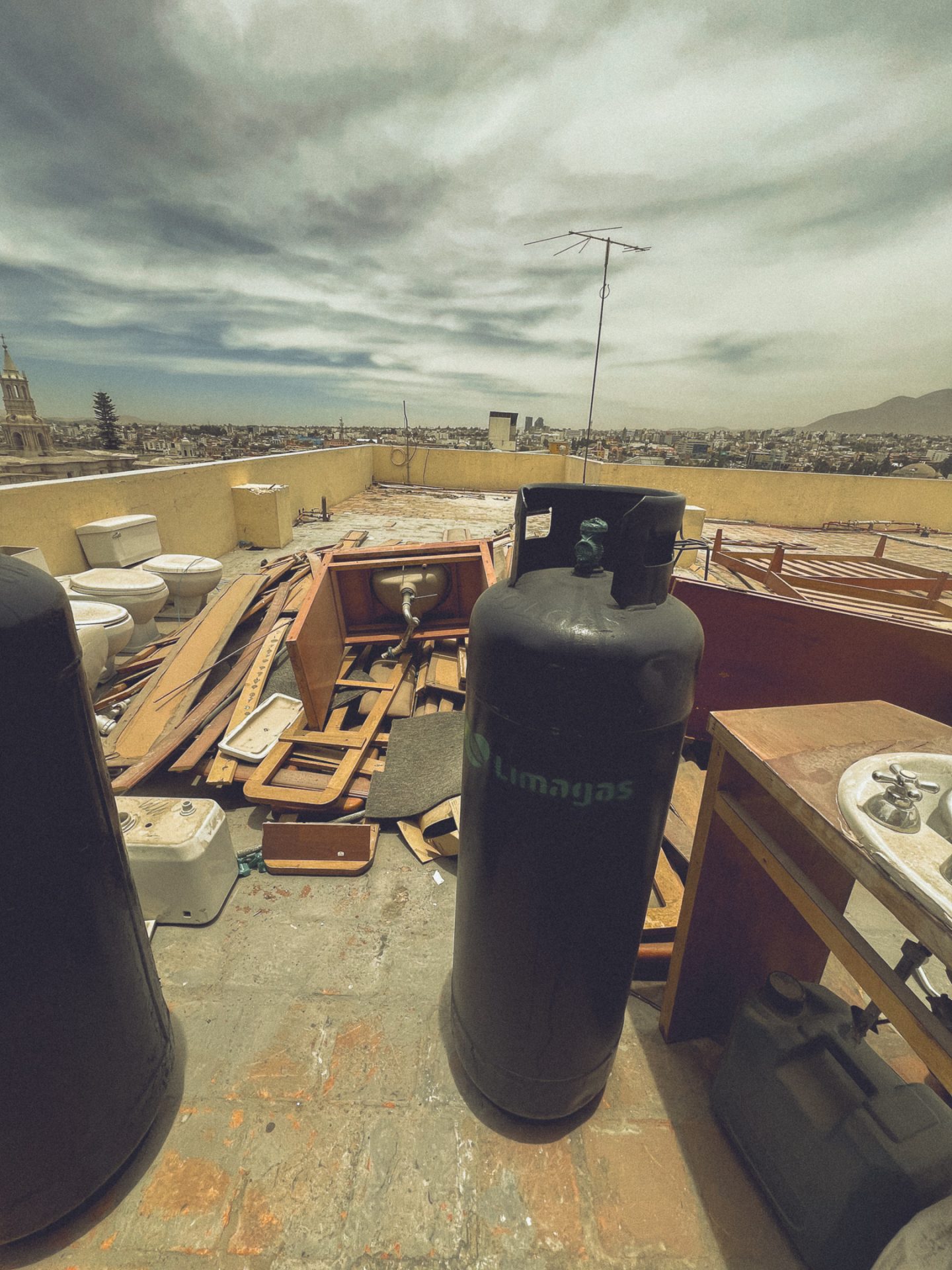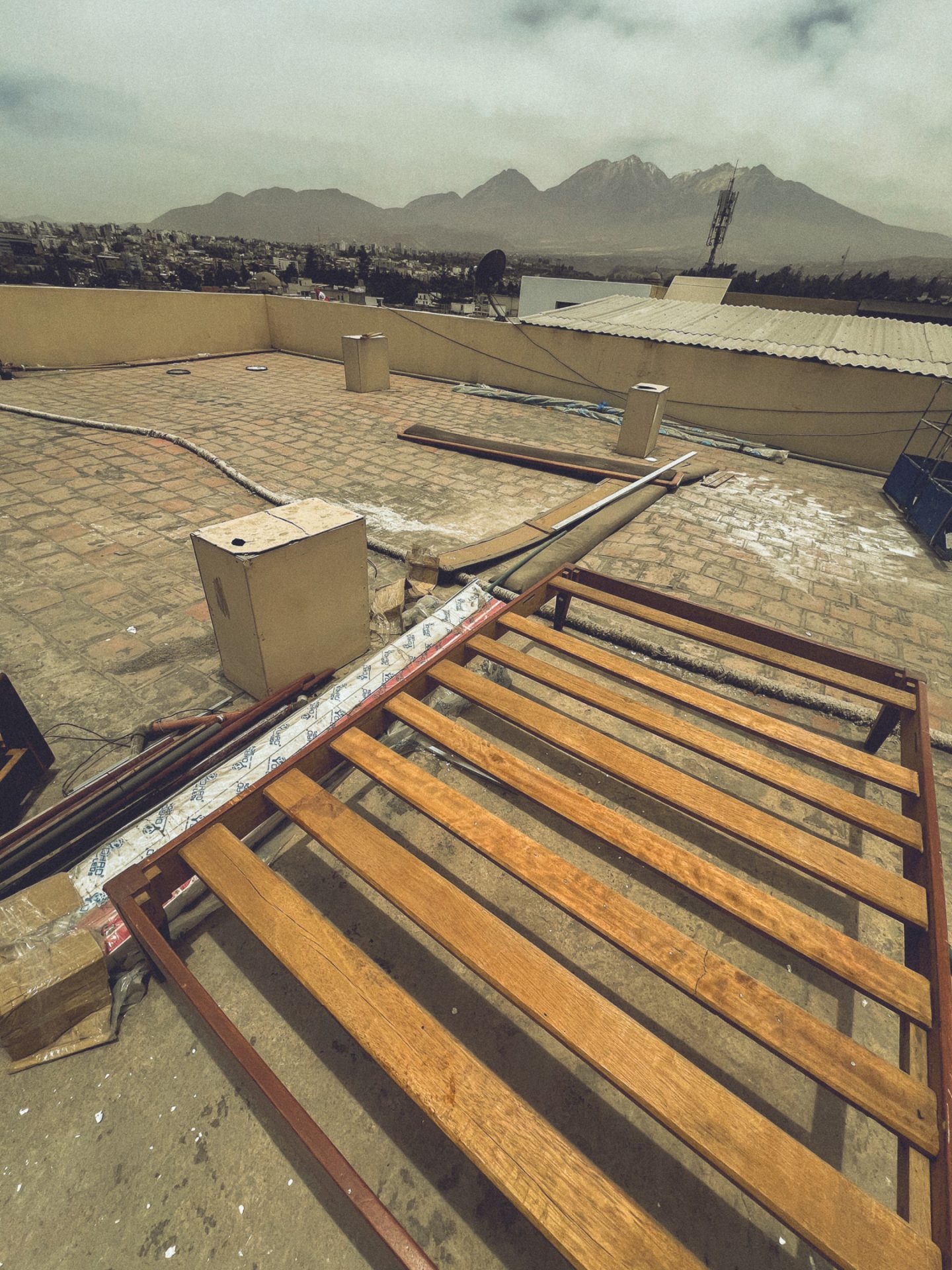 Nachdem ich fertig war, ging ich erst einmal wieder aufs Zimmer und recherchierte, was ich heute hier noch unternehmen konnte und was es in Ica bzw. Huacachina zu sehen gab. Ich packte außerdem schon einmal meine Rucksäcke und bereitete mich darauf vor, die Nacht im Bus zu verbringen. Da ich den ganzen Tag mit dem Kamerarucksack unterwegs gewesen war und nicht alles mitschleppen wollte, musste ich eine zusätzliche Tasche packen. Ich checkte aus und fragte, ob ich vom Dach des Hotels ein paar Fotos machen dürfte. Glücklicherweise wurde mir das erlaubt, jedoch hatte ich mir etwas mehr erhofft. Die Aussicht selbst war super, jedoch war es sehr diesig, sodass man die Berge kaum erkennen konnte. Außerdem herrschte auf dem Dach absolutes Chaos, überall lagen Gasflaschen, alte Toiletten und Betten herum. 🏨