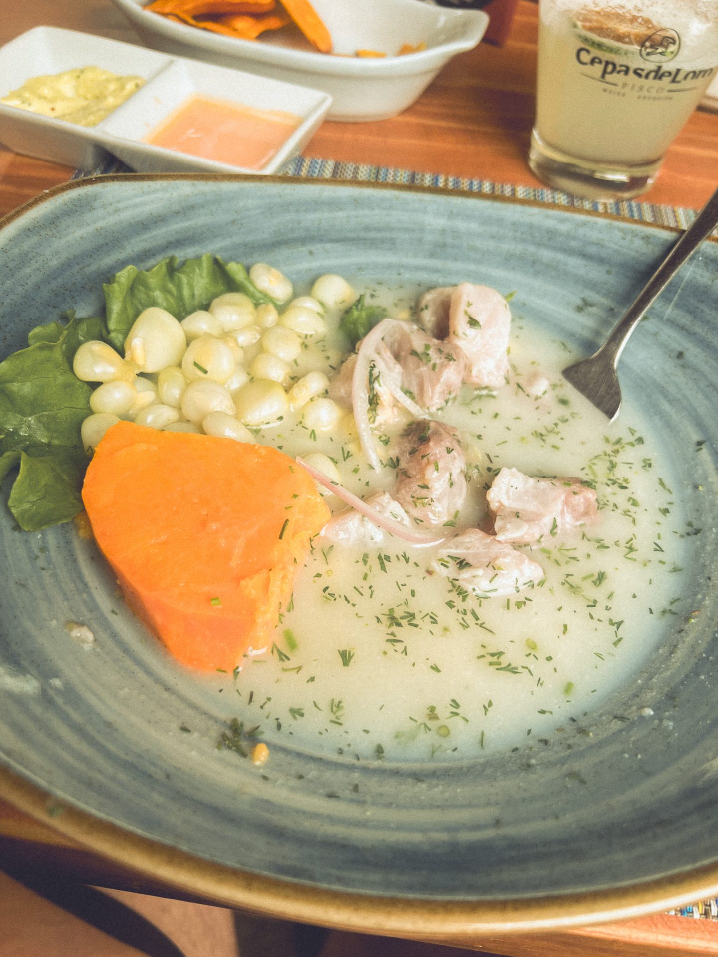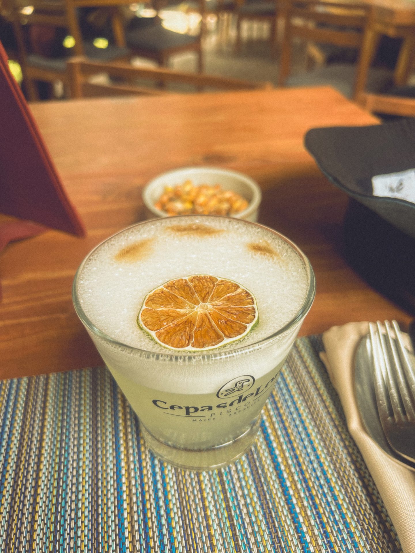 Nach etwa 45 Minuten setzte ich meinen Weg fort und überlegte, was ich tun könnte. Eigentlich wollte ich mir ein Café suchen und den Nachmittag mit Schreiben verbringen. Letztendlich entschied ich mich dann aber doch für ein Restaurant und wollte nur etwas trinken. Als ich dann aber die Speisekarte in den Händen hielt, ließ ich mich verleiten und bestellte erneut Ceviche, um einen Vergleich zu haben. Dazu gab es einen Pisco Sour, wie am ersten Tag in Lima. Beides war wirklich sehr lecker, auch wenn mir die Säure irgendwann auf der Zunge brannte. Währenddessen schrieb ich an meinem Blog weiter und bestellte mir irgendwann einen zweiten Pisco Sour. Die Zeit verging wie im Flug, ich bekam noch Chips mit Dip aufs Haus und konnte so meinen Nachmittag genießen. 🍸