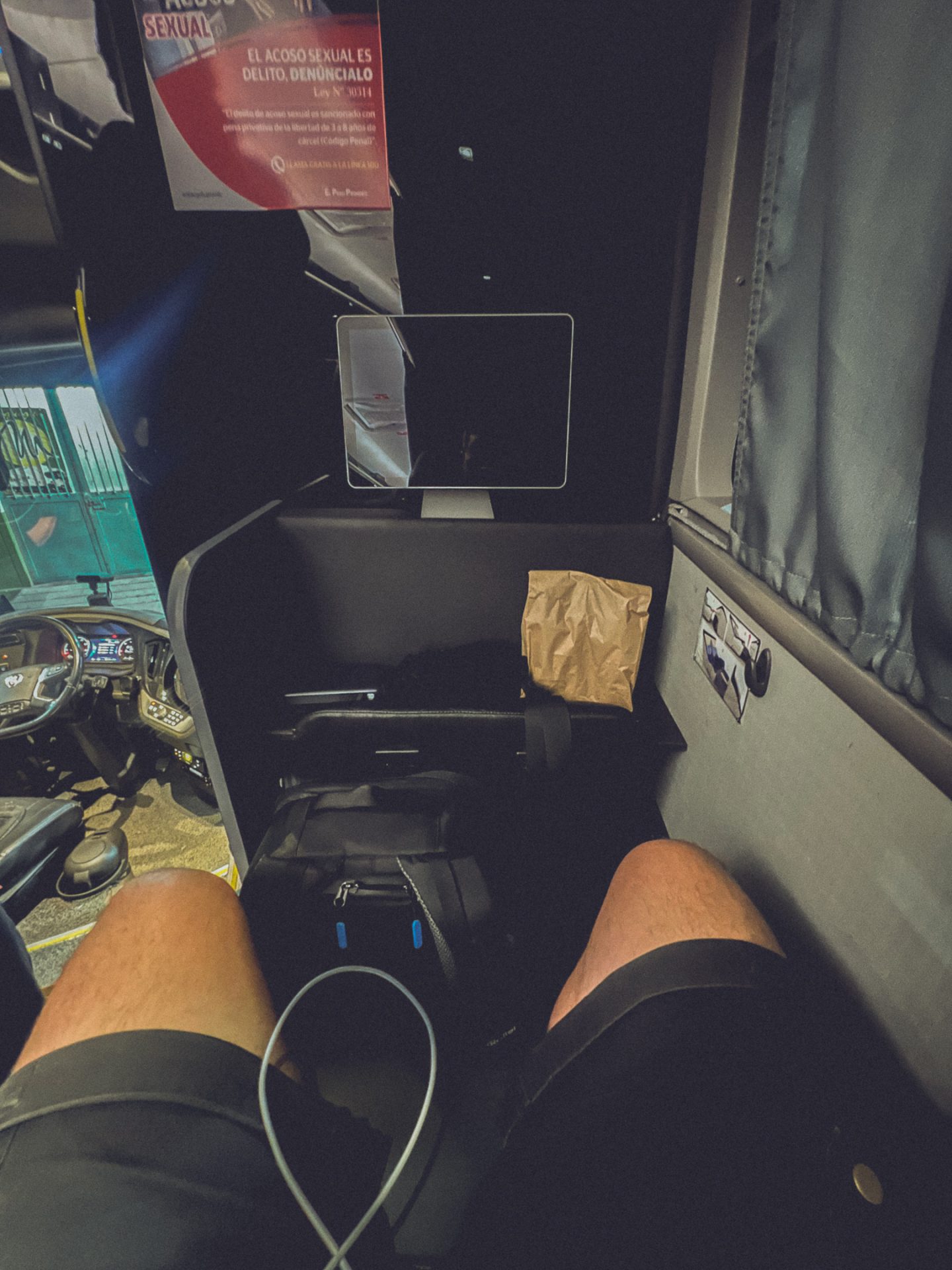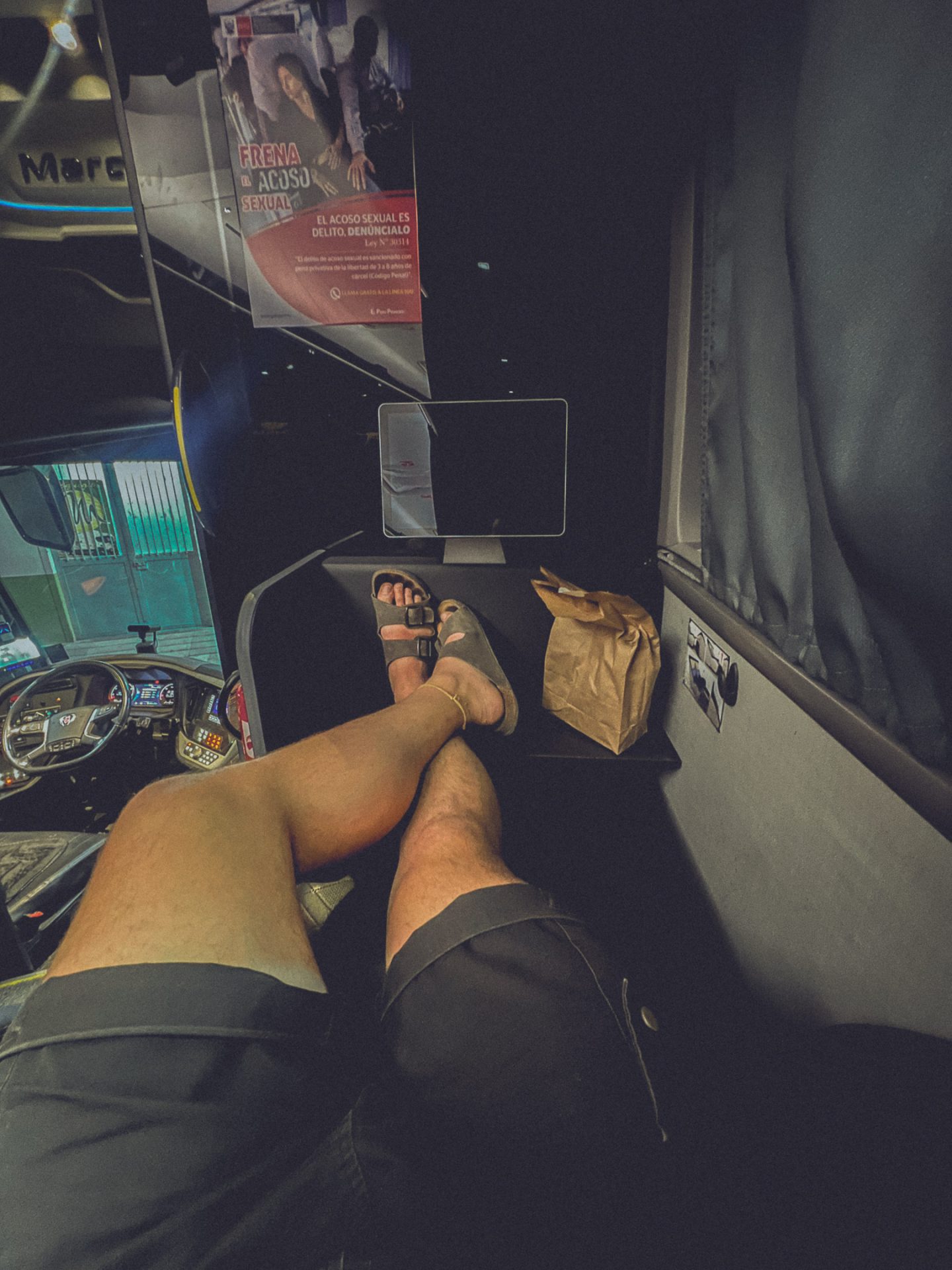 Um 18:45 Uhr kam ich schließlich am Bahnhof an. Mein Bus fuhr um 19:15 Uhr los, also sollte es passen. Ich musste mein Gepäck wie am Flughafen aufgeben. Das dauerte eine gefühlte Ewigkeit, weil alles total planlos ablief. Um 19:00 Uhr hatte ich mein Gepäck endlich los, musste noch eine Gebühr von 3 Sol bezahlen – wofür, weiß ich nicht – und konnte dann zur Boarding Area gehen. Dort ging ich lieber noch einmal kurz auf die Toilette und stieg anschließend gleich in den Bus. Bei der Ticketkontrolle erhielt ich noch ein Snackpaket mit Wasser, worüber ich mich freute, da es wenigstens eine Kleinigkeit zu essen gab. 🍫