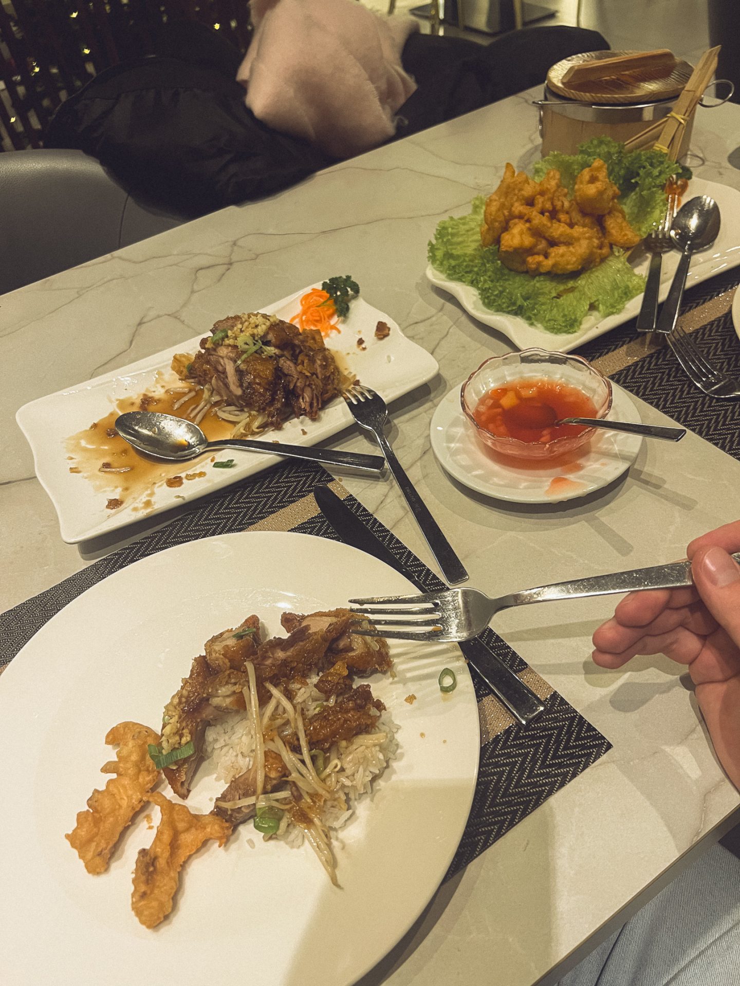 Außer uns gab es nicht viele andere Gäste – wir waren aber auch mit 18:00 Uhr sehr früh dran. Wir bestellten Edamame und eine Miso-Suppe als Vorspeise. Dazu gab es zwei Kir Royale für uns. Erst als die Suppe kam, merkten wir beide, dass sie sehr algig, also fischig, war. Das war nichts für Amelie, daher hatte Jonas sie für sich ganz allein. Nach ein paar Minuten kam schon der Hauptgang. Für Amelie gab es frittiertes Hähnchen mit Mandel-Panade und für Jonas gebackene Ente. Dazu gab es noch eine Schale Reis für uns beide und alles war perfekt! Das Essen war sehr lecker, und wir bestellten uns noch einen Kir Royal dazu. Wir ließen den Abend gemütlich im Restaurant ausklingen. Da wir es nicht weit zum Hotel hatten, konnten wir direkt danach ins Bett fallen. 🧑🏻‍🍳🛌