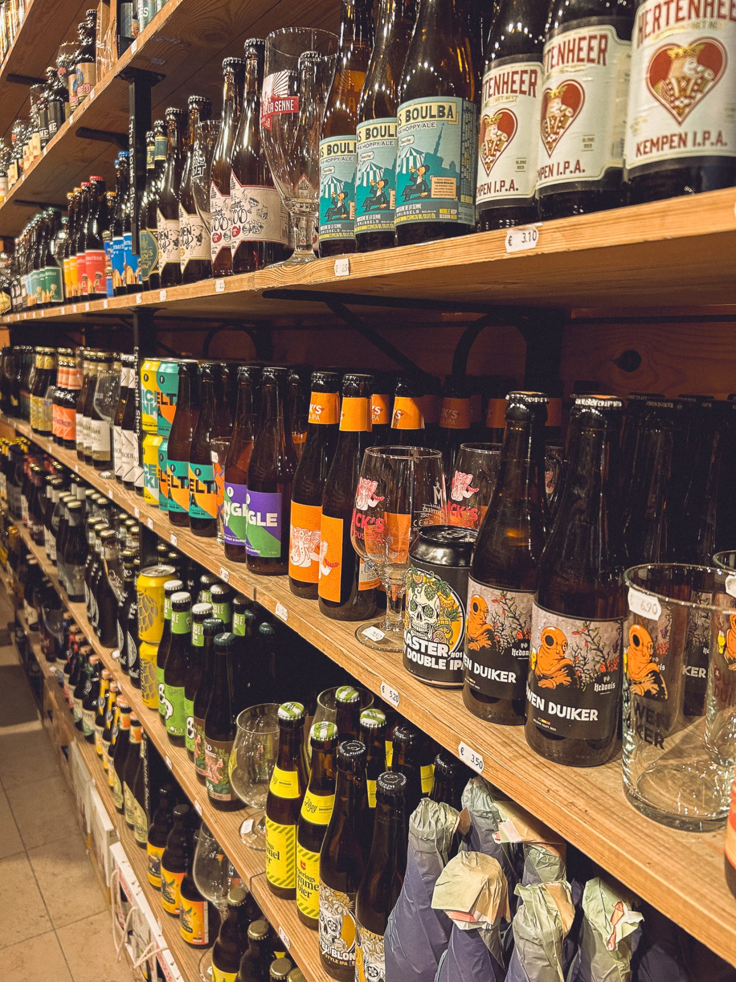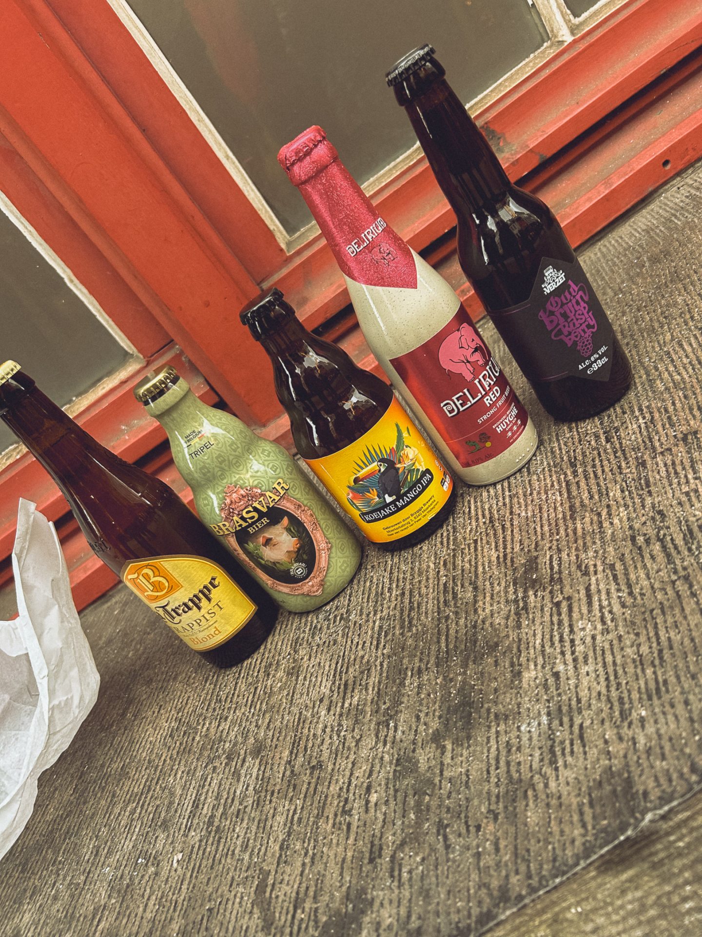 Anschließend packten wir zusammen  inkl. zweier Biergläser als Souvenir und gingen zurück auf den Stadtplatz. Unser heutiger Reiseführer Jonas hatte noch ein paar Sehenswürdigkeiten auf der Liste, also ging es zuerst zum Burgplatz und dem Rathaus von Brügge. Anschließend versuchten wir, dem Trubel zu entkommen, und gingen stadtauswärts. Beim Flanieren durch die Gassen entdeckten wir einen Bierladen „The Bottle Shop“ mit etwa 300 Sorten Bier sowie diversen Ginsorten, Rumsorten und Whiskeys. Wir suchten uns hier noch ein paar Schmankerl aus. Ein Bier für jetzt und eins für unser Abendessen später. 🛍️