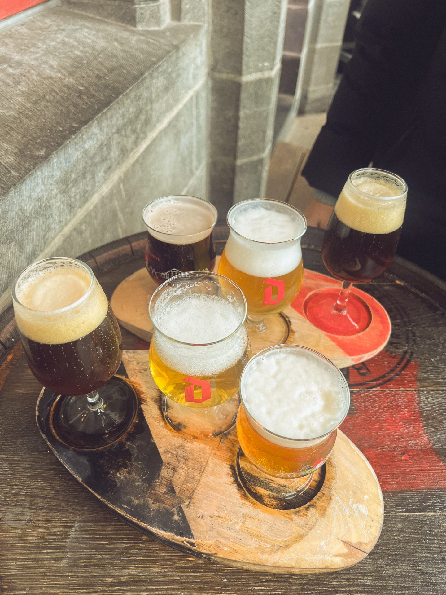 Im Erdgeschoss des Gebäudes konnte man sich für 28 € pro Person die Geschichte von Brügge mit einer VR-Brille anschauen. Im ersten Stock gab es eine Bar, in der man für 16,50 € ein Bier-Tasting machen konnte. Ganz klar, wofür wir uns entschieden haben. Wir gingen in das Gebäude, gingen an den Tresen, wo man sich das Ticket für die Historie mit VR-Brille kaufen konnte, bogen rechts ab und gingen in den ersten Stock auf den Balkon wo wir das Bier bekommen. Dort bestellten wir das Bier-Tasting. Jonas kam mit zwei kleinen Brettern zurück, die jeweils mit drei Sorten Bier bestückt waren. Insgesamt hatten wir sechs verschiedene Biere und probierten uns bei schönem Ausblick auf die Menschenmassen am Markt durch alle Sorten durch. Unser Urteil fiel ausgewogen aus. Drei von sechs Bieren waren gut und würden wir wieder bestellen. Die anderen Sorten waren eher weniger unser Geschmack.