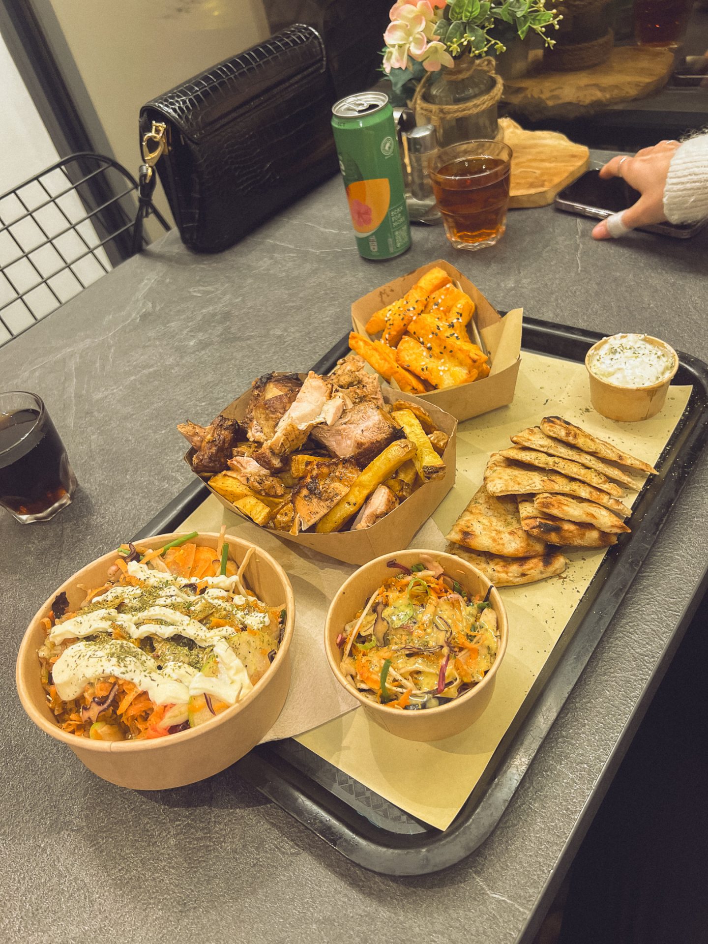 Wir überlegten dann wie immer was wir essen sollten. Das kalte asiatische Essen machte uns eher weniger an und deswegen haben wir etwas in der Nähe gesucht. Es gab einen Griechen, der eigentlich eher griechisches Fast Food angeboten hat. Da gingen wir hin, da es nur ein paar Minuten weg war und bestellten uns ein Special Menu mit etwas Beilagen dazu. Das war ein gemischter Schwein/Putenspies mit Pommes, Coleslaw und dazu gegrillten Halloumi. War super lecker, das Fleisch war auch top! Nur etwas viel, den Rest haben wir wie immer mitgenommen, damit wir das morgen zum Frühstück mit dem Asiatisch hatten. Anschließend gings zurück zur Parkgarage in der wir uns fast verlaufen hätte, weil sie 1km lang war. Endlich am Auto angekommen und aus der Tiefgarage geschichen, gings 20 Minuten bei Schneefall zurück zum Hotel! 🚗
