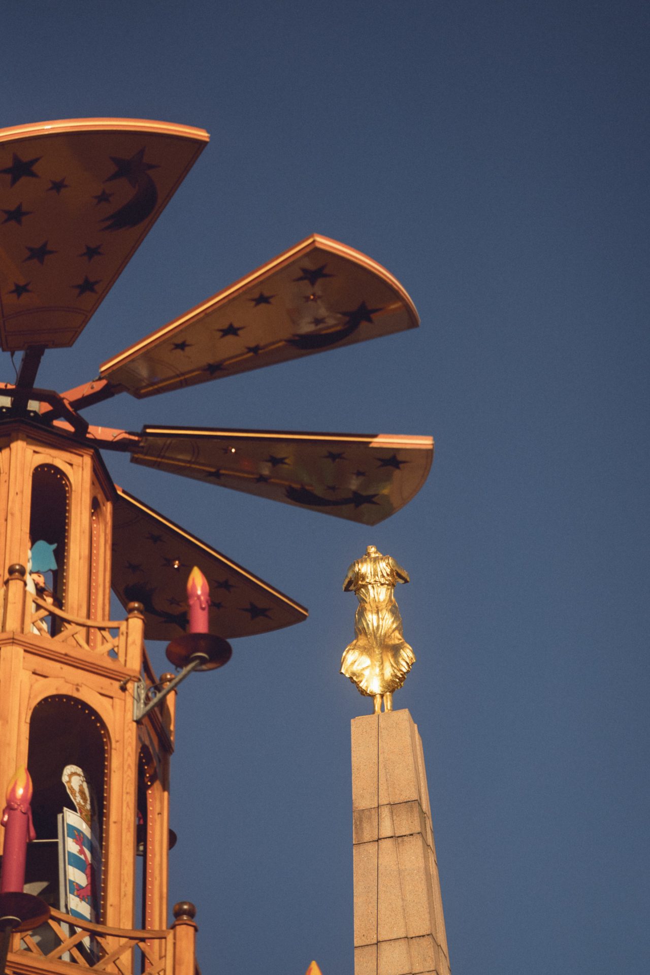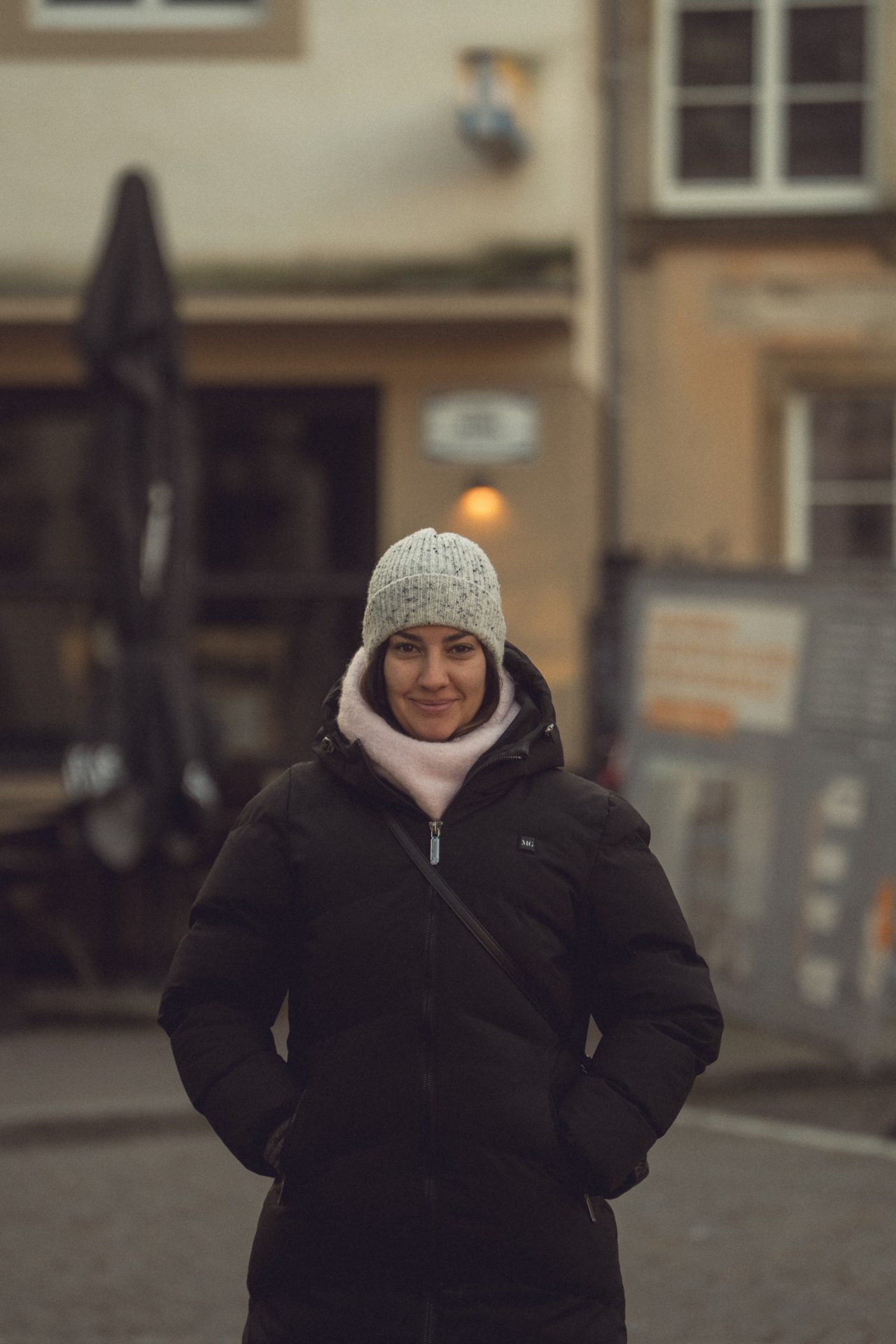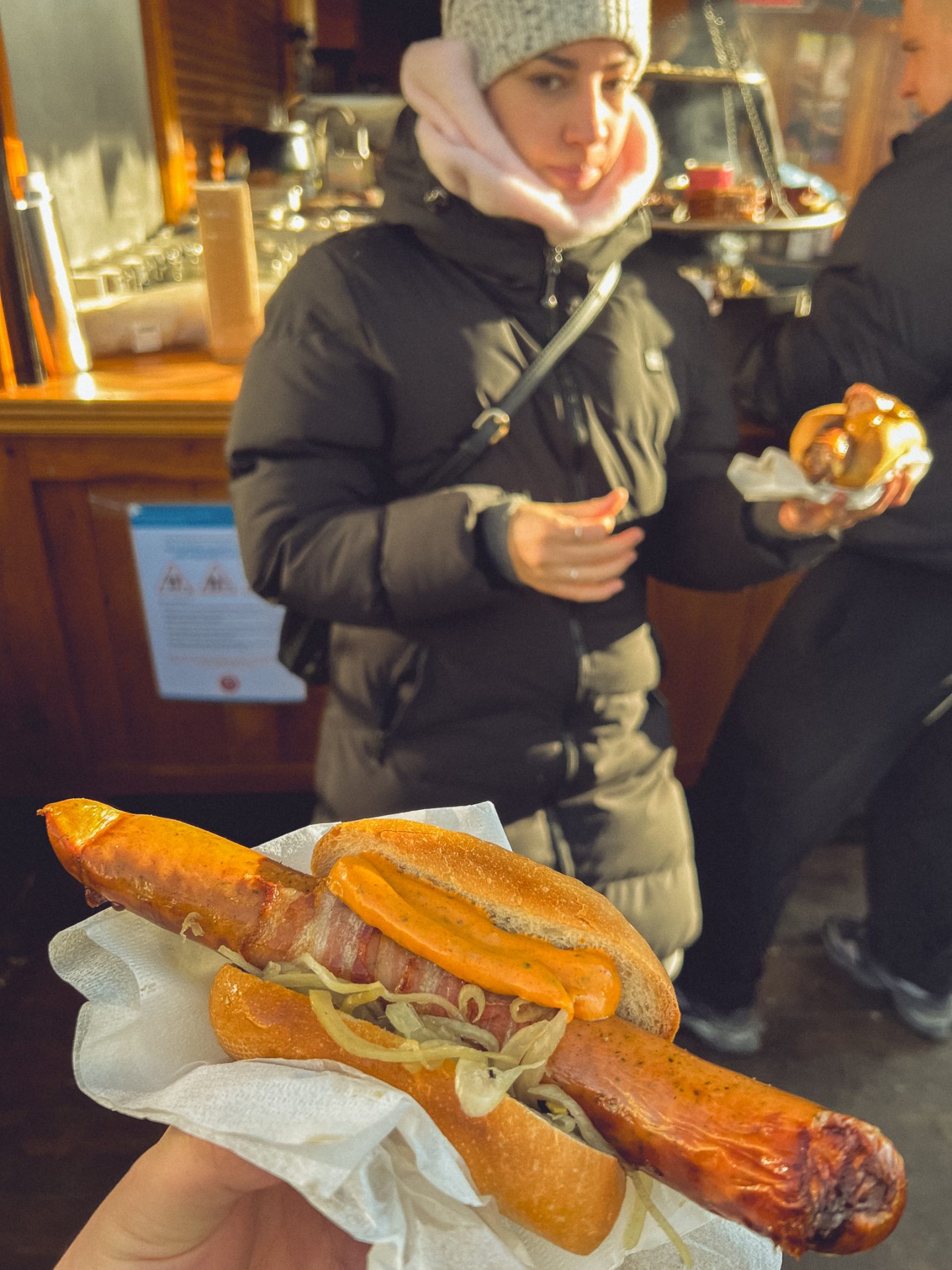 Wir marschierten recht schnell wieder los und standen bald darauf mitten im nächsten Christkindlmarkt. Hier beschlossen wir, noch einmal richtig zu frühstücken, und bestellten zwei Kaskrainer. Jonas‘ Kaskrainer selbstverständlich mit Zwiebeln als Extra-Topping. Nachdem wir diese aufgegessen hatten, konnte die richtige Touri-Tour erst richtig losgehen. 💪🏼