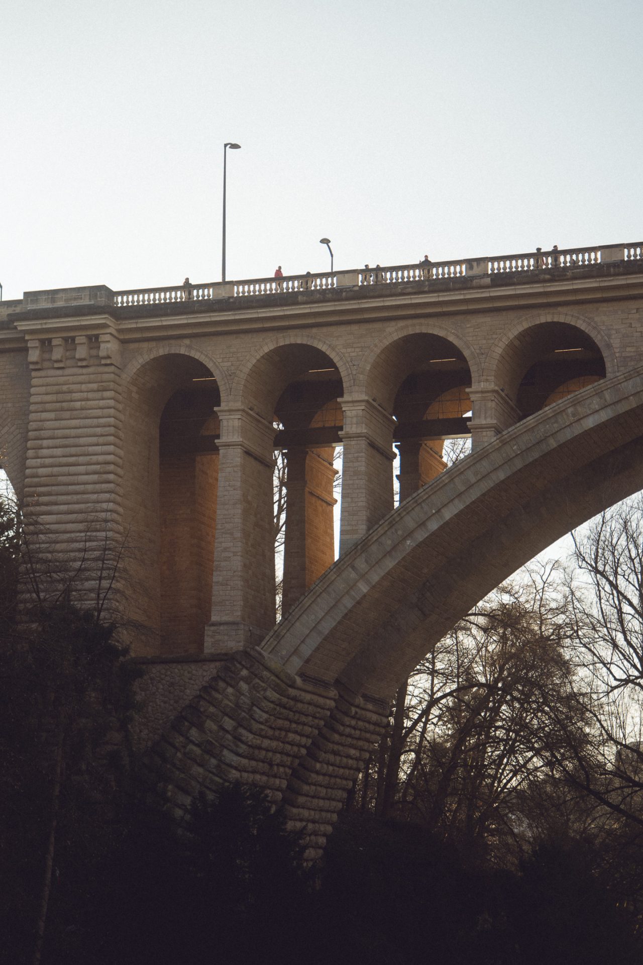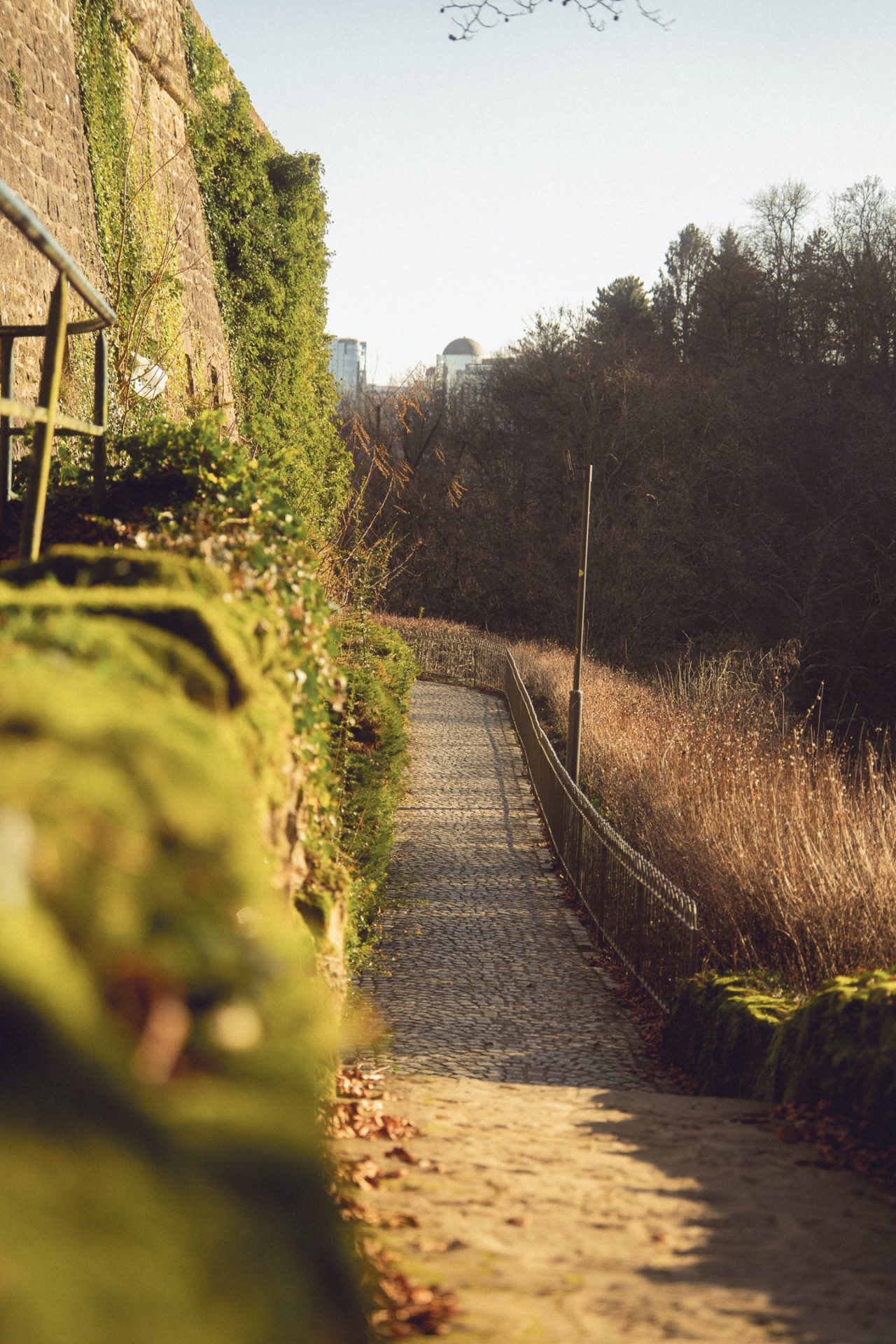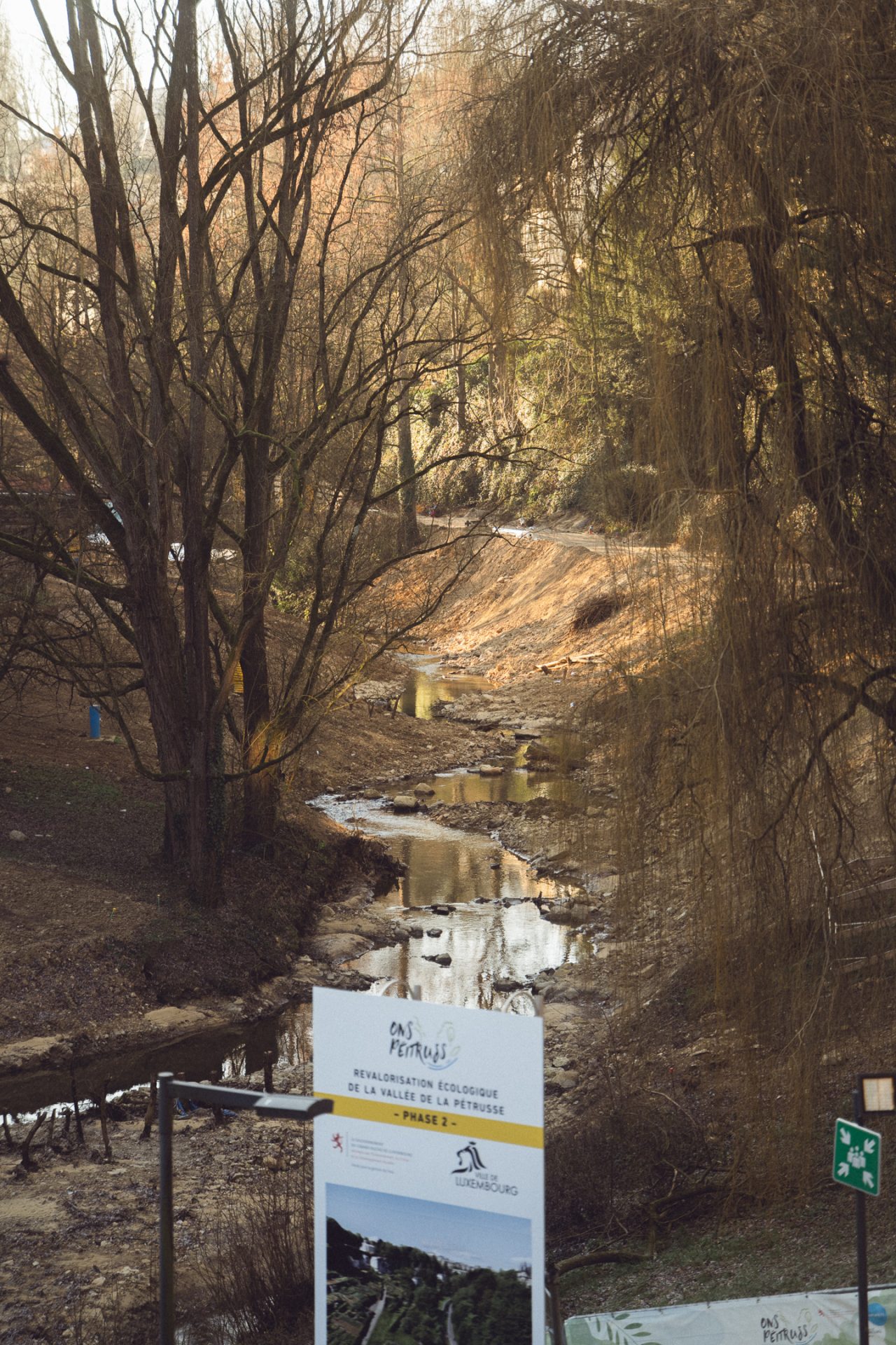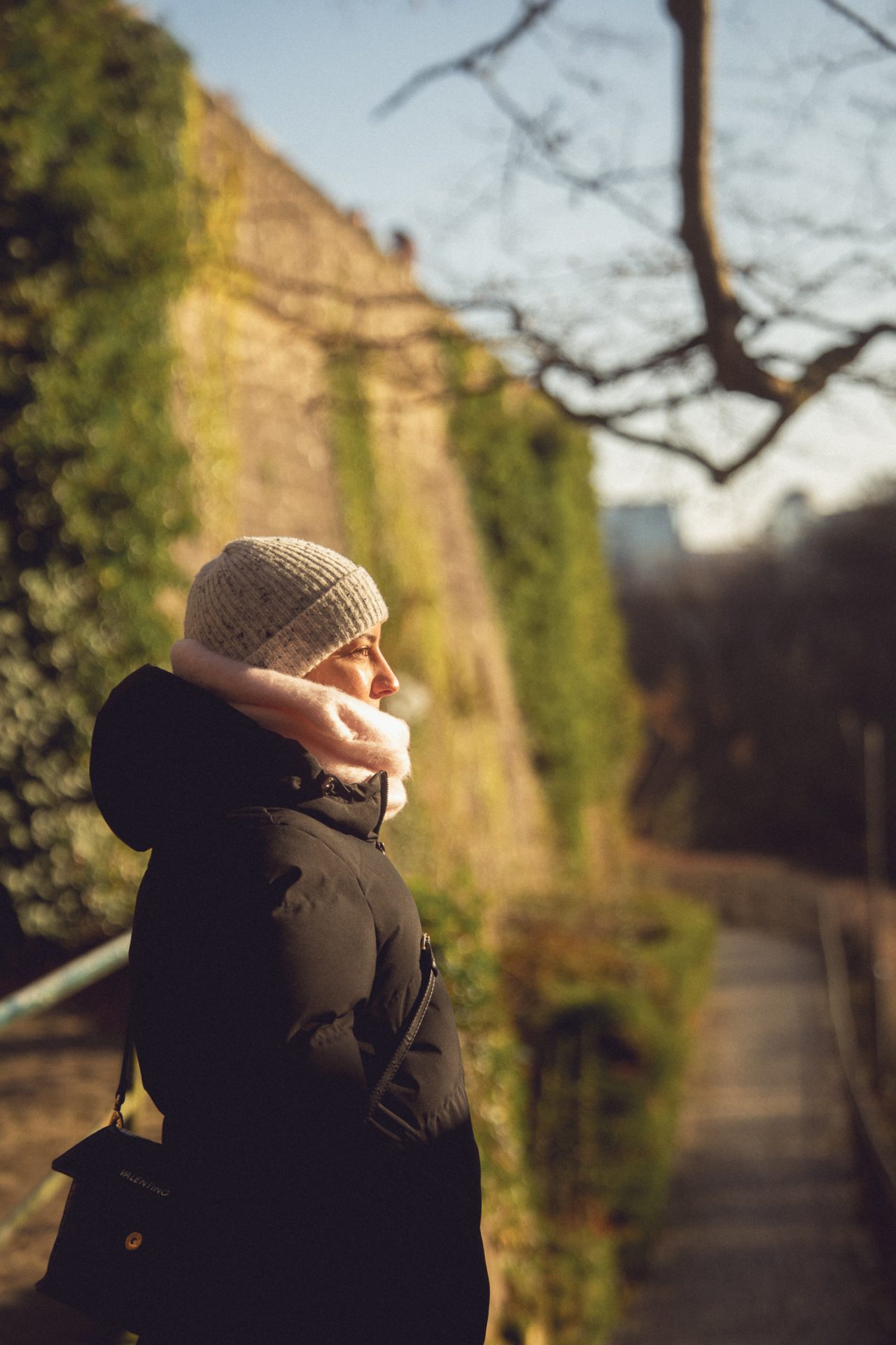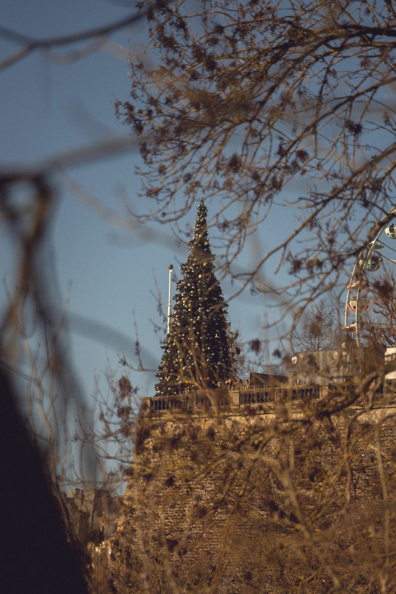Von hier aus sind wir mit der Straßenbahn wieder ins Zentrum gefahren und am nächsten Christkindlmarkt ausgestiegen. Da wir genug von Menschenmengen und Christkindlmärkten hatten, beschlossen wir, wieder aus dem Zentrum rauszugehen und diesmal den Weg unter der Brücke der La Passerelle zu erkunden. In der Schlucht gingen wir einige Meter, bis wir die Kasematten entdeckten. Leider war das hier nur der Ausgang. Da es sich aber spannend anhörte, Untergrundwege und verborgene Katakomben zu besichtigen, folgten wir den Schildern, um den Eingang zu finden. Wir gingen die gesamte Schlucht bis unter die Adolph-Brücke, fanden aber trotzdem den passenden Eingang nicht.