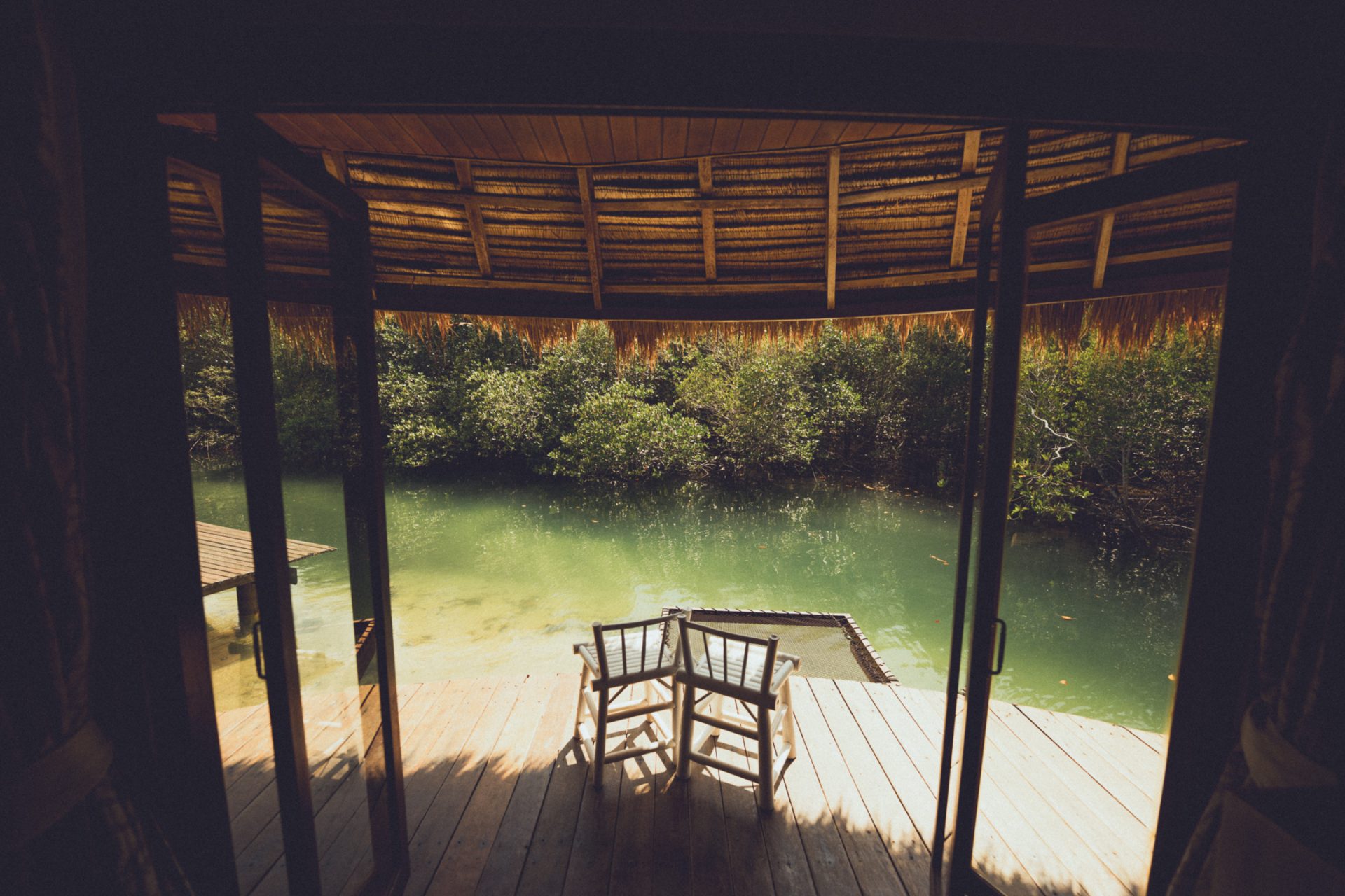 Als wir dort ankamen, waren unsere Rucksäcke schon nicht mehr an der Rezeption sondern wurden bereits ins Zimmer gebracht. Die Mitarbeiter dort wussten natürlich auch sofort Bescheid als sie uns gesehen haben und sind sofort gekommen um uns zu unserem neuen Zimmer bzw. Villa zu bringen. Wir sind dort über einen Steg gelaufen und hatten wirklich riesen Glück mit dem Zimmer! Wir haben das mit der besten „Aussicht“ bzw. Position bekommen, wenn man das so nennen dürfte. Denn wir waren direkt an der Spitze und konnten so in den Mangrovenwald schauen – richtig schön! 🛖