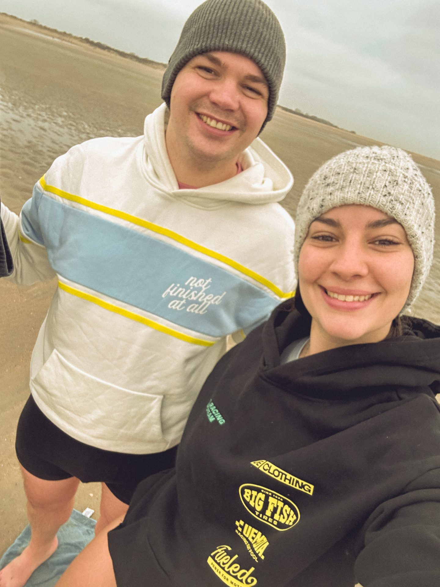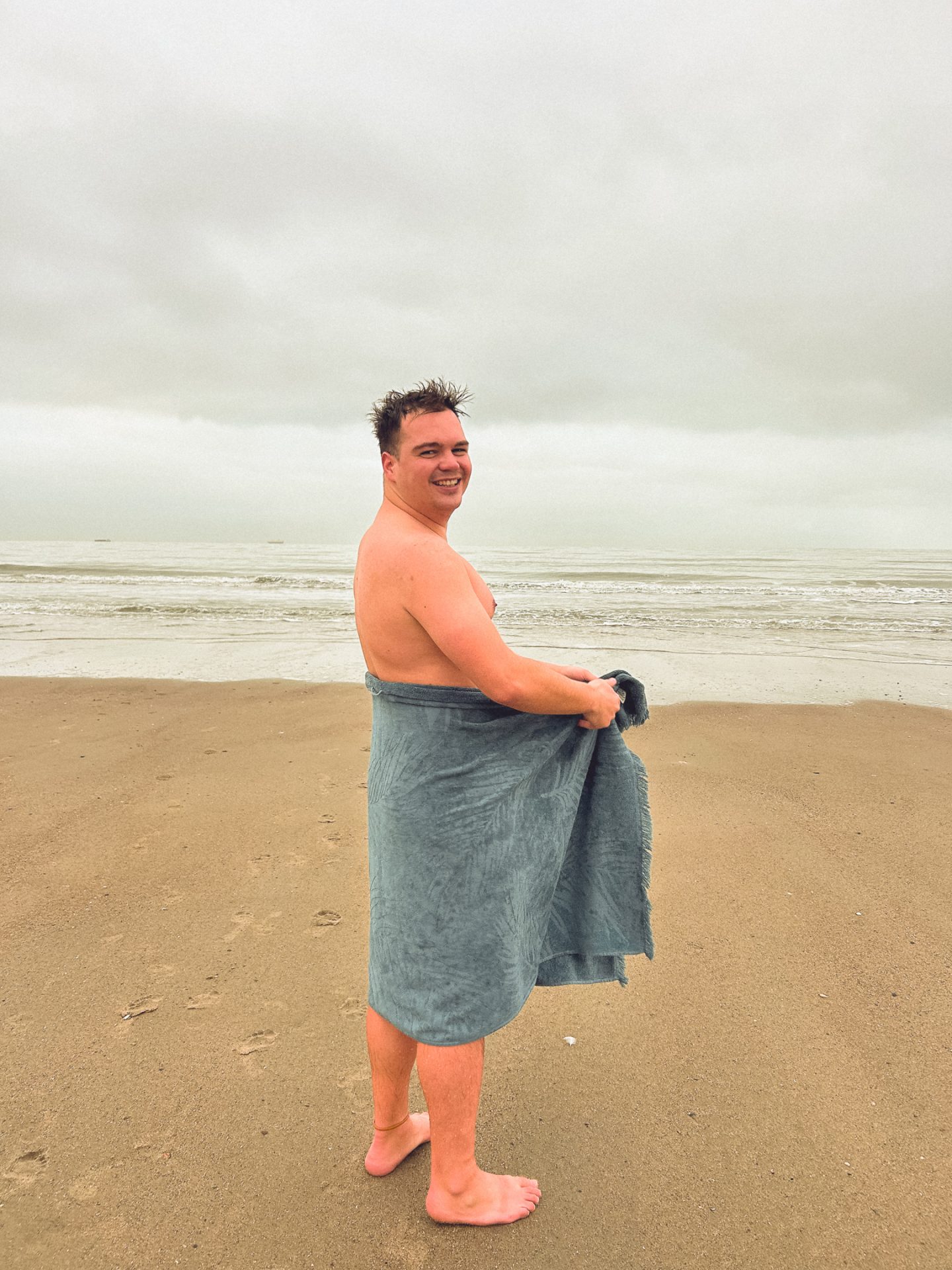 Bei stolzen 5 °C Wasser- und Lufttemperatur sind wir dann ohne zu zögern nackt in das eiskalte Wasser gelaufen. Es dauerte keine Minute, bis wir wieder aus dem Wasser raus waren und uns abgetrocknet haben. Als wir dann festgestellt haben, dass es gar nicht so schlimm war, wie wir erwartet hatten, ist Amelie noch mal ins Wasser gesprintet und Jonas natürlich direkt hinterher. Danach waren wir wirklich sehr stolz, dass wir einfach Eisbaden in der Nordsee waren und das gleich zweimal. Wir haben uns direkt wieder warm angezogen und sind zurück zum Auto gelaufen. Auf dem Weg wurden klassischerweise, wie immer am Meer, noch ein paar Muscheln als Andenken eingepackt. 🐚