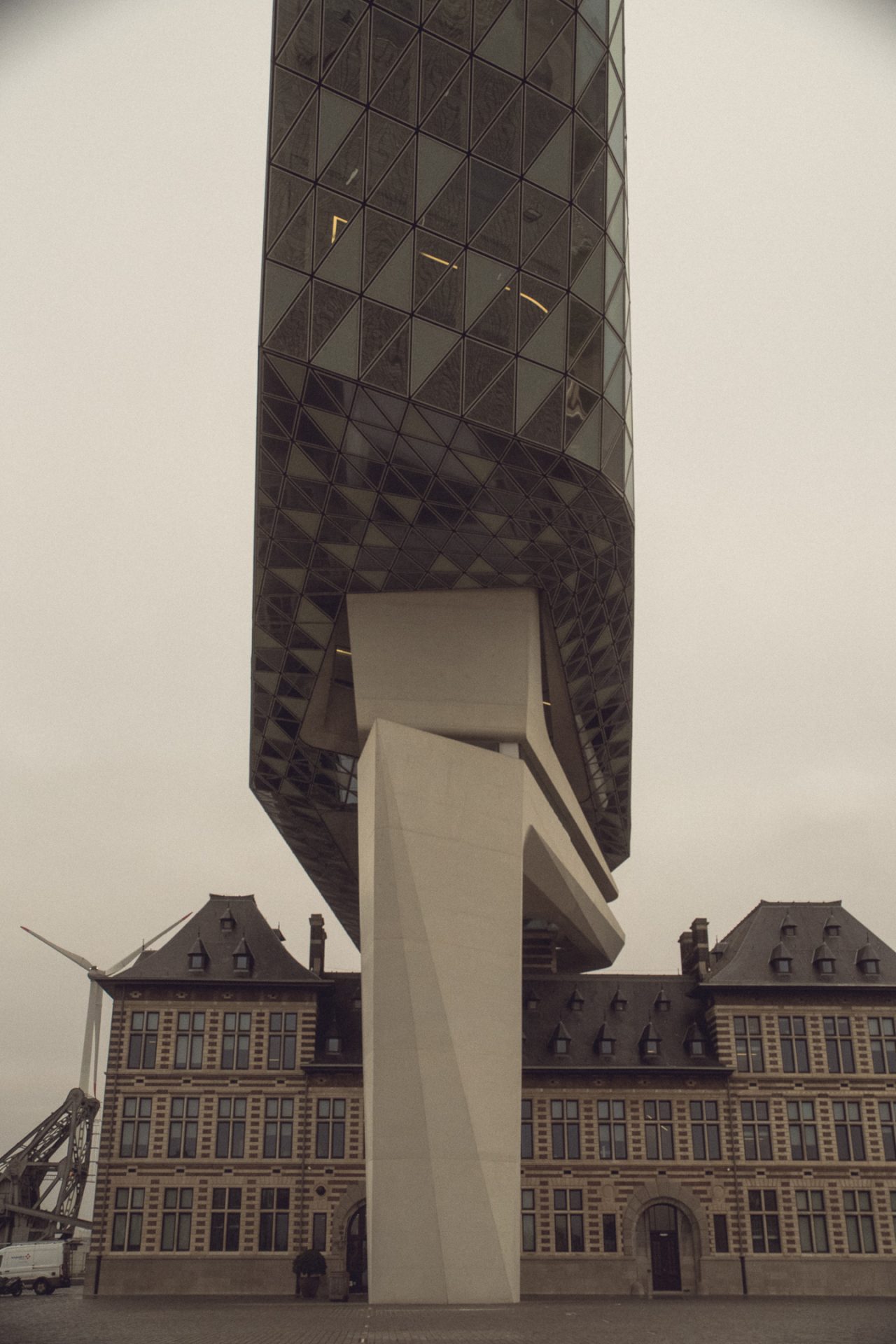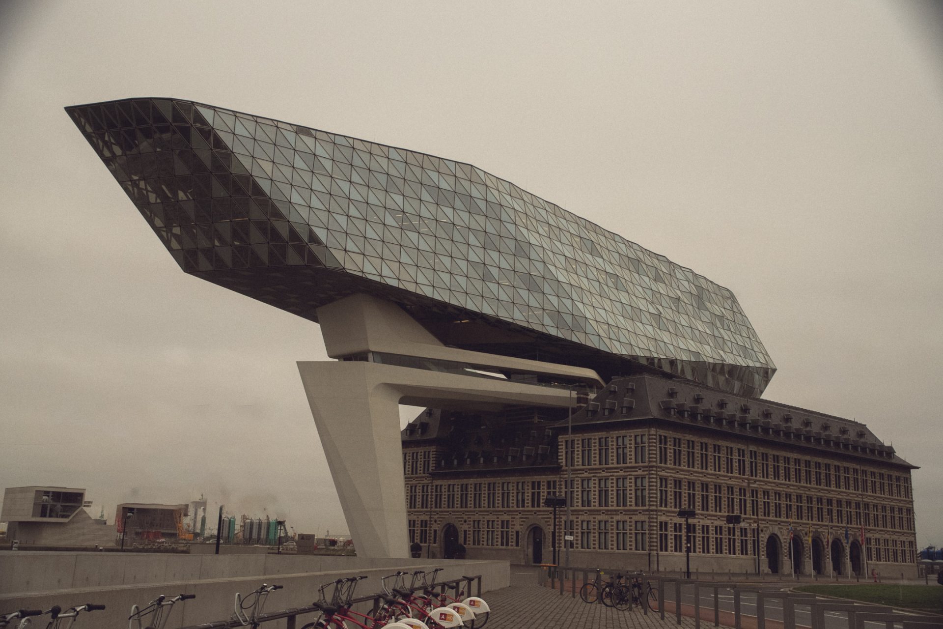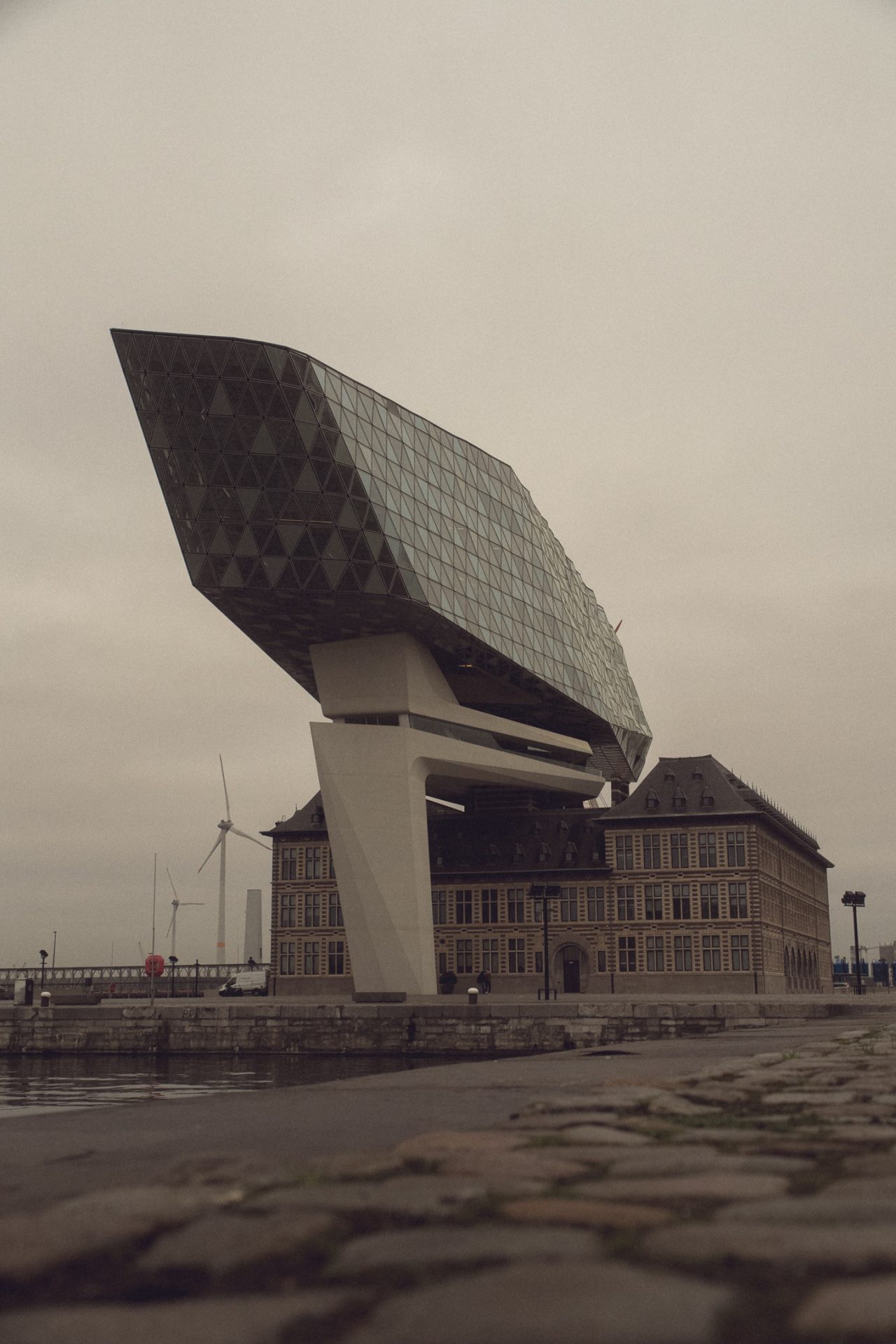 Zurück am Auto ging die Fahrt dann los. Zuerst noch zum Hafenhuis Port. Den Stopp haben wir am Vortag nicht mehr geschafft, weil es zu Fuß einfach zu weit gewesen wäre. Das Gebäude ist die klassische Mischung, wie wir sie in Antwerpen oft gesehen haben, ein uraltes Gebäude mit alten Fassaden und einem spektakulären modernen Anbau. Das alte Feuerwehrhaus wurde aufgestockt mit einem modernen Beton- und Stahlanbau, welcher die Hafenzentrale beinhaltete. Nach ein paar Fotos, erstaunten Blicken, wie das Gebäude überhaupt so stehen konnte, und einem Toilettenbesuch sind wir wieder zurück ins Auto, und die eigentliche Fahrt an die belgische Küste konnte endlich losgehen. ⚓️